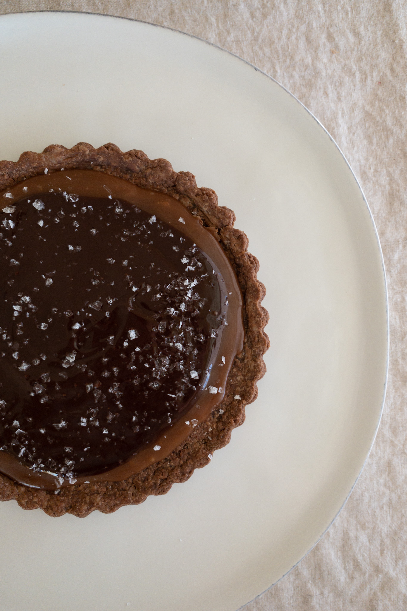 A brittle chocolate tart filled with caramel and topped with sea salt