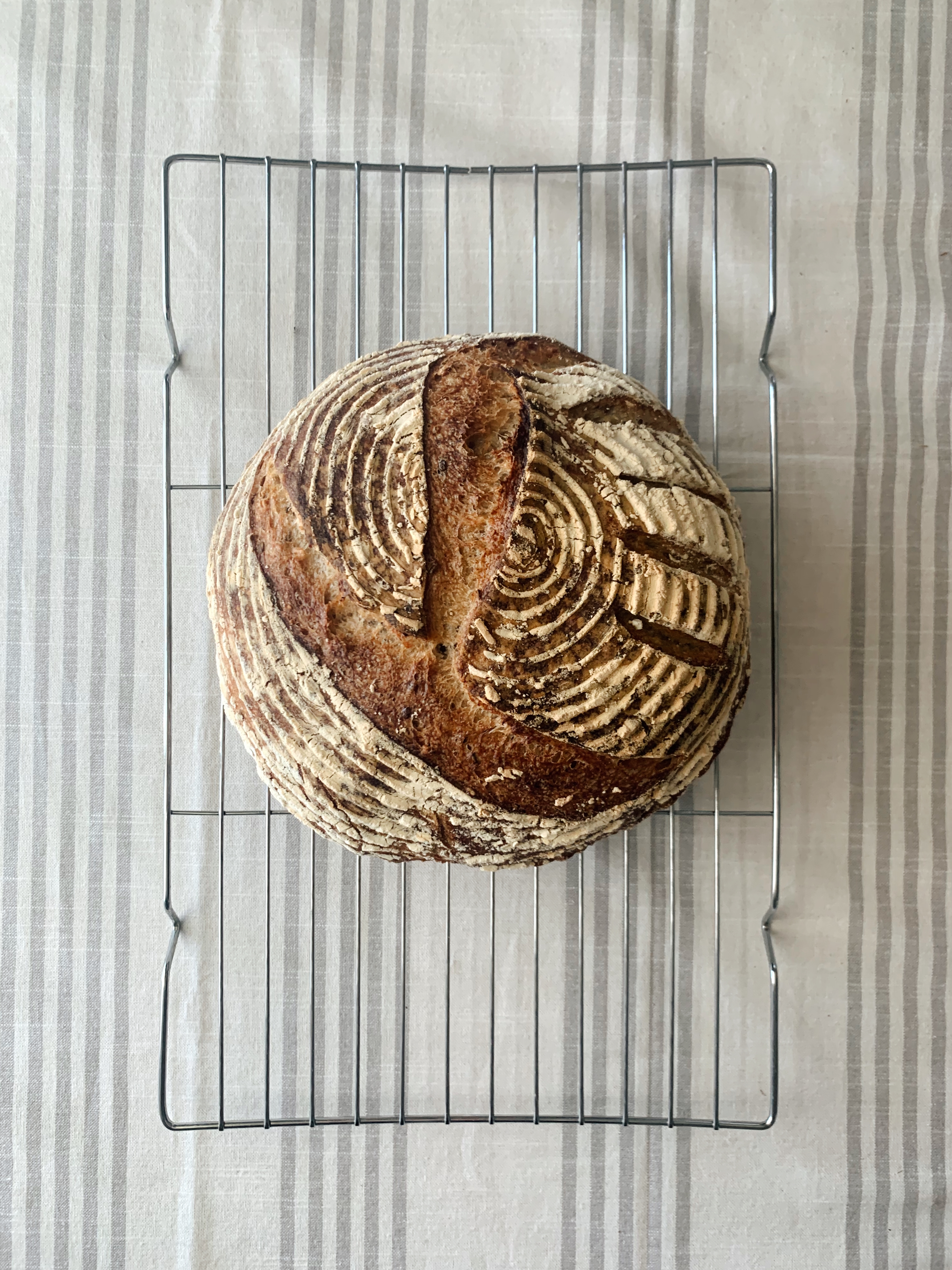 Freshly baked sourdough made with rye flour and a mix of seeds and oats.